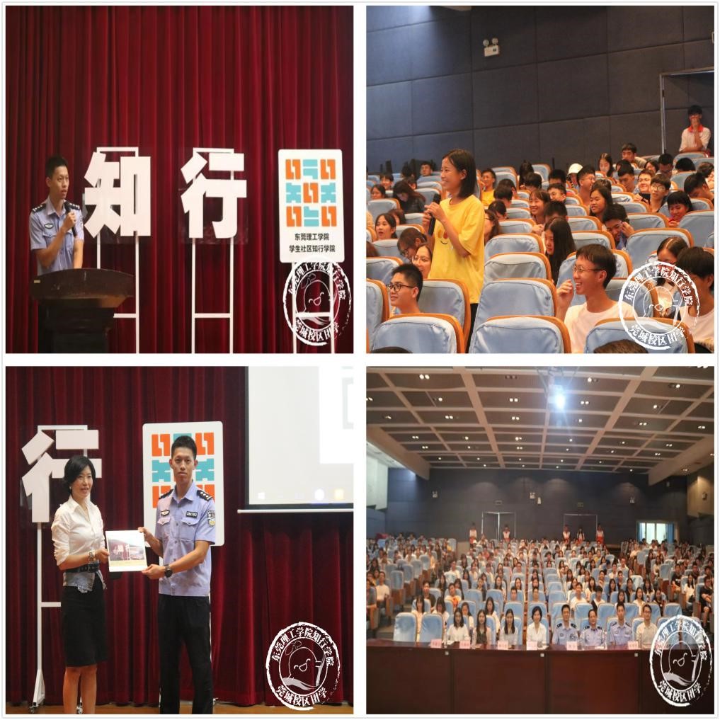 为了提高同学们预防电信诈骗的警惕心,理性消费,11月6日,学生社区知行学院携手莞城公安分局举办的“双十一购物有风险,阿sir教你辨识套路”主题知行讲堂在学术报告厅举行。本次讲堂由莞城刑侦大队侦查员黄燮明主讲,莞城公安分局、东正派出所、知行学院相关负责人以及驻校社工出席本次讲座,莞城校区320名学生聆听了讲座。