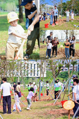 校友与师生代表们纷纷扛起铁锹、提着水桶,投入到热火朝天的植树劳动中,挥锹铲土、扶苗定植、覆土压实、提水浇灌……不少校友以家庭为单位参与,孩子们在父母的陪伴下兴致勃勃地参与植树,现场欢声笑语不断,洋溢着爱校荣校的温暖氛围。