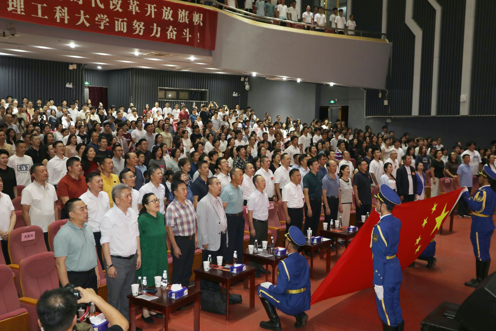 “起来!不愿做奴隶的人们!把我们的血肉,筑成我们新的长城!”9月18日晚,雄壮庄严的国歌在松山湖校区礼堂内响起。在国家一级指挥、中国人民解放军军乐团原团长于海教授的指挥下,全场1300余名领导嘉宾、师生校友面向国旗、齐声高唱,澎湃的爱国热情激荡在莞工校园之中。