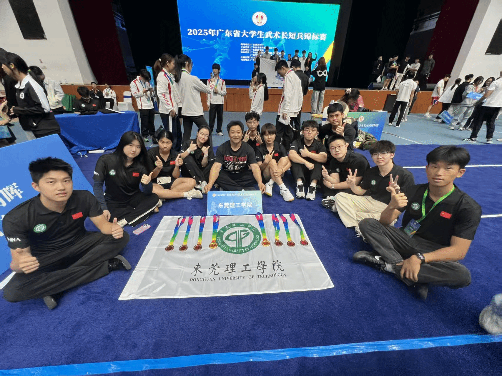 东莞理工学院武术队在此次赛事中表现亮眼,由潘荣远老师担任领队、张恒老师出任主教练,14 名队员带着扎实的武术功底与顽强的竞技斗志,在多场对抗中与众多强校对手展开激烈角逐,最终脱颖而出,斩获2 枚金牌、6枚铜牌,另有4名队员跻身项目第五名,充分展现了学校在传统武术竞技领域的深厚实力与学子风采。