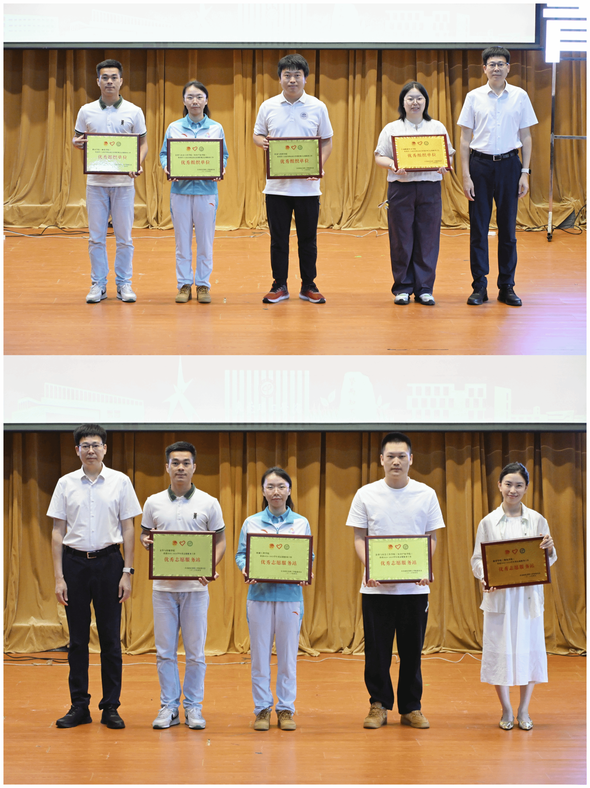 在表彰环节,学校依次对十五运会和残特奥会优秀赛会志愿者代表、优秀指导老师,2024-2025学年优秀学生志愿者代表、优秀学生志愿服务工作者代表,以及生命健康技术学院、经济与管理学院、法律与社会工作学院(知识产权学院)、教育学院(师范学院)等十五运会优秀组织单位,文学与传媒学院、机械工程学院、法律与社会工作学院(知识产权学院)、教育学院(师范学院)等学院的志愿服务站颁发荣誉证书。