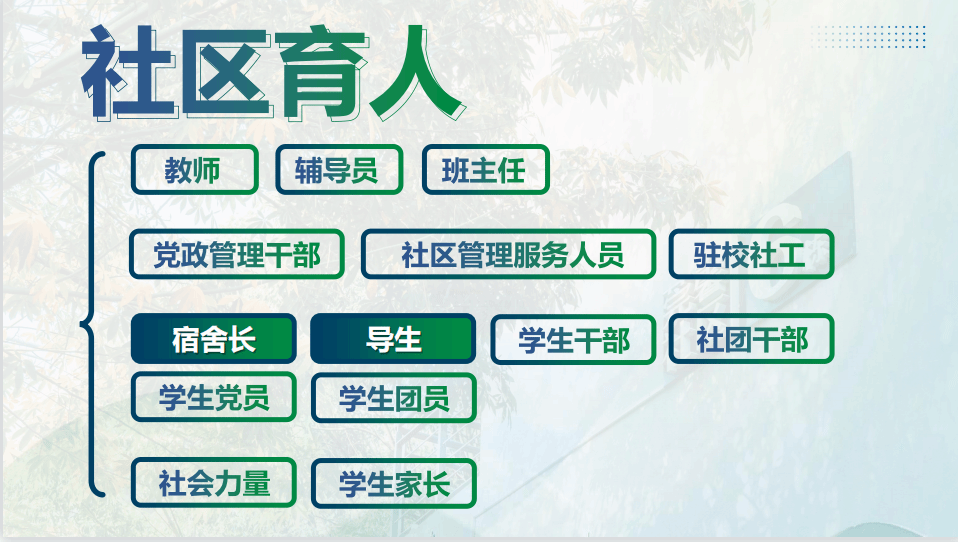 宿舍长和导生是“社区育人、双工联动”背景下学校压实到一线的育人力量,通过网格化的管理,调动学生主体作用,发挥朋辈育人力量,全员参与社区育人工作。