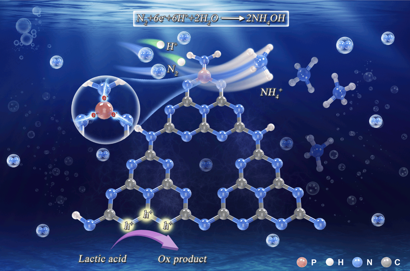 Haber–Bosch法合成氨奠定了现代化工行业的基础,但这一技术依赖高温、高压的苛刻条件进行反应,存在能耗高、污染大等弊端。光催化合成氨是一种清洁、可持续、低成本、反应条件温和的固氮新技术。然而,设计制备兼具高电荷分离效率及N2吸附/活化能力的光催化剂材料仍面临挑战。论文通过引入含有类似三均三嗪环结构的磷源六氯环三磷腈,成功构建了含有P-N键的多孔g-C3N4纳米片催化剂,系统研究了P-N键的植入与高电荷分离效率及N2吸附/活化能力的相互关系。发现引入P原子构建的P-N-C键不仅能够稳定地锚定g-C3N4表面暴露的活性N原子,同时会使得更加局部化的电荷密度分布,有利于还原位点和氧化位点的空间分离,有效地增强电子和空穴的快速表面反应。P原子位点成为了N2分子吸附和活化的关键活性位点,更多的光生电子从P位点转移到吸附的N2分子上,有利于光催化合成氨反应的高效进行。本研究工作为基于异质原子掺杂工程来构建活性位点和调控电荷迁移路径用于高效光固氮提供了新的思路。