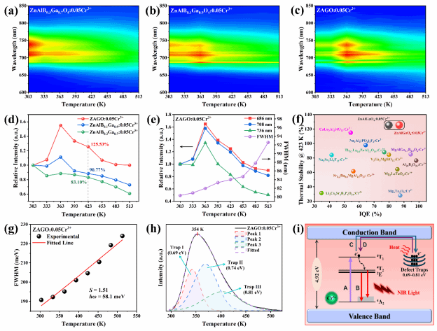 近年来,近红外(NIR)光在夜视、生物成像、监测和检测等新兴技术领域被广泛应用。其中,NIR荧光转换发光二极管(pc-LEDs)是备受瞩目的理想光源。近红外荧光材料是NIR pc-LEDs的关键组成部分,高量子效率和热稳定性是其实现最佳性能的必备属性。然而,设计制备兼具这两者属性的荧光材料仍面临挑战。在本文中,团队设计了一种新型的ZnAlB(1-x)GaxO4:Cr3+体系。体系中,随着Ga逐步替代B,光致发光性能出人意料地显著提升,并在x = 1时达到峰值效率。进一步的研究开发了ZnAlGaO4:yCr3+荧光材料系列,随着Cr3+含量的增加,其半峰宽从32 nm到163 nm。这归因于两个Cr3+发射中心之间的能量传递。在这些荧光材料中,ZAGO:0.05Cr3+表现出最优性能,具有80%、34%的高内、外量子效率和80 nm的半峰宽。值得注意的是,该荧光材料展示出反温度猝灭现象(125.53% @ 423 K),其卓越的热稳定性通过缺陷能级模型得以解释。使用ZAGO:Cr3+荧光材料制备的NIR pc-LEDs在植物栽培、夜视、无损分析和静脉成像等多功能应用中展现了巨大前景。