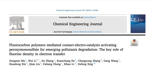 近日,我校生态环境工程技术研发中心吕斯濠教授团队的李威副研究员在环境领域国际知名期刊《Chemical Engineering Journal》上发表了题为“Fluorocarbon polymers mediated contact-electro-catalysis activating peroxymonosulfate for emerging pollutants degradation: the key role of fluorine density in electron transfer”的研究论文。该成果以东莞理工学院为第一署名单位,生态环境工程技术研发中心马冬梅博士后为第一作者,生态环境工程技术研发中心李威副研究员与哈尔滨工业大学邢德峰教授共同通讯作者,该研究得到国家重点研发计划、广东省基础与应用基础研究基金、广东省高校重点科研平台和项目、东莞理工学院博士后启动资金以及黑龙江省重点研发计划的资助。