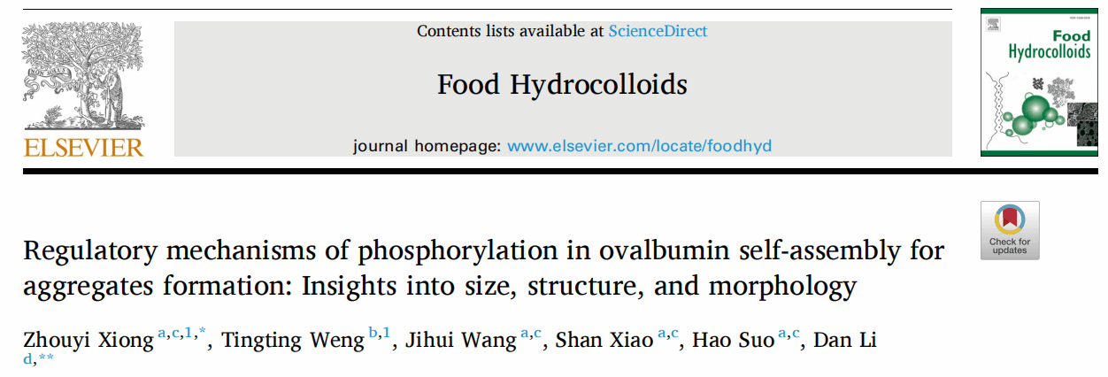 近日,我校生命健康技术学院王际辉教授团队在国际食品顶级期刊《Food Hydrocolloids》发表题为“Regulatory mechanisms of phosphorylation in ovalbumin self-assembly for aggregates formation: Insights into size, structure, and morphology”的研究性文章。该成果以东莞理工学院为第一署名单位,生命健康技术学院熊舟翼特聘副研究员为第一作者,通讯作者为新加坡国立大学食品科学与技术系助理教授LI Dan。
