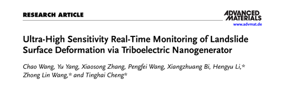 近日,我校机械工程学院汪超副教授团队与中国科学院北京纳米能源与系统研究所程廷海研究员课题组合作在TOP期刊《Advanced Materials》上发表了题为“Ultra-High Sensitivity Real-Time Monitoring of Landslide Surface Deformation via Triboelectric Nanogenerator”的研究论文。该成果以东莞理工学院机械工程学院为第一署名单位,汪超副教授为第一作者,机械工程学院研究生杨宇为共同第一作者,纳米能源所程廷海研究员、王中林院士、李恒禹博士后为共同通讯作者,研究得到广东省基础与应用基础基金项目等项目资助。