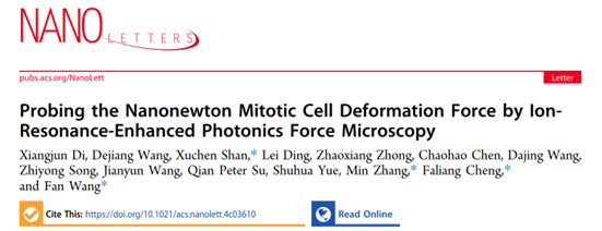 近期,我校程发良教授团队在生物探针技术取得研究进展,相关成果以“Probing the Nanonewton Mitotic Cell Deformation Force by Ion-Resonance-Enhanced Photonics Force Microscopy“为题发表在材料学领域TOP期刊《Nano Letters》,并被选为封面。该论文以东莞理工学院为第一单位,博士后狄香君是该论文的第一作者,程发良教授和张敏教授为通讯作者。
