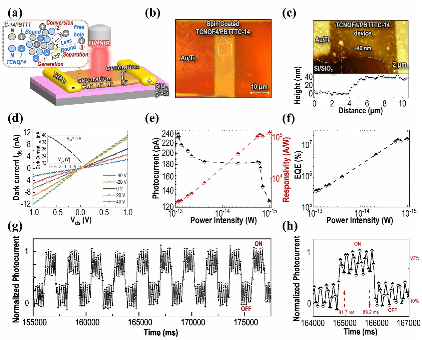 图1. 1.0μm时,TCNQF4/C14-PBTTT的微观性能和光电性能分析