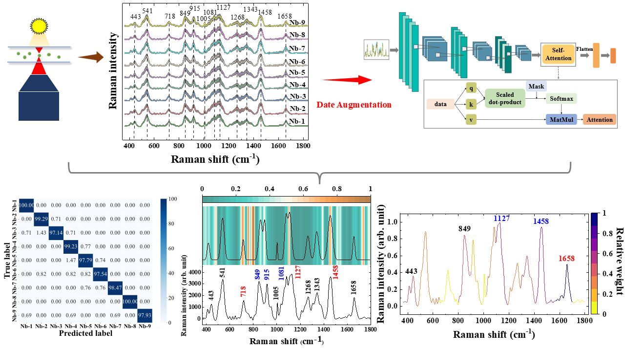 近年来,家蚕微孢子虫(Nosema bombycis, Nb)已被认为是一种危险的病原体,它可通过游离孢子迅速传播导致感染。由微孢子虫感染导致的微粒子病对家蚕业产生严重威胁,每年都会给丝绸业和农业带来巨大的经济损失。因此,如何在单细胞水平上准确识别家蚕微孢子至关重要。在本文中,研究团队创新地提出了一种单细胞拉曼光谱结合自注意力机制介导的卷积神经网络模型,实现准确、快速地识别家蚕微孢子。在自注意力机制和数据扩增技术的辅助下,自注意力机制介导的卷积神经网络模型对家蚕孢子的平均预测准确率提高了将近 18%,从原来的 83.93 ± 4.88% 提高至 99.27 ± 0.25%。此外,研究团队还提出了一种名为阻挡单个拉曼波段的方法进一步提取光谱分类特征。研究结果显示,1658、1458、1127 和 849 cm-1这4个拉曼峰位的差异,对99.27 ± 0.25% 的预测准确率产生主要的贡献。本研究建立的分析方法在家蚕微孢子虫的早期诊断和微粒子病监控等领域具有巨大的应用前景。
