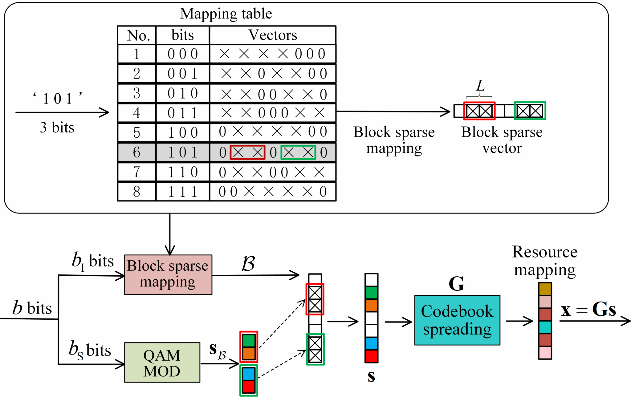 图1. BSVC方案的稀疏映射过程示意图。每3比特信息被映射到一个长度为7并包含2个非零块的稀疏矢量中。
