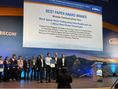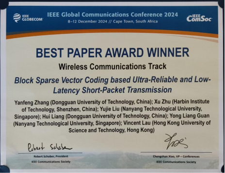 近期,我校领衔的东莞市“战略科学家团队”在无线通信领域取得研究进展,相关成果以“Block Sparse Vector Coding based Short-Packet Transmission for URLLC”为题发表在2024年IEEE 全球通信大会上,并获得“最佳论文奖”(获奖率<1%)。该论文东莞理工学院为第一单位,哈尔滨工业大学(深圳)、南洋理工大学、香港科技大学为合作单位,团队张雁峰博士为论文第一作者,梁辉副教授为共同作者。