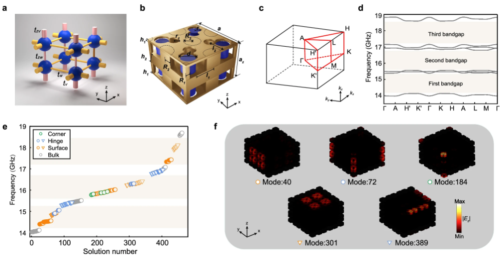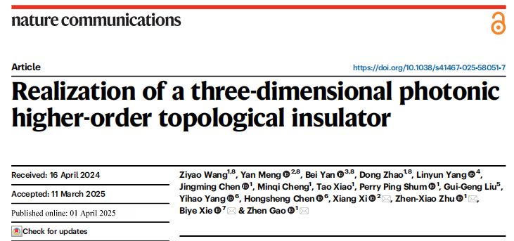 近日,我校光学工程研究团队与南方科技大学等单位合作成功在类紧束缚模型的金属笼光子晶体中实验实现了三维光学高阶拓扑绝缘体。相关成果以“Realization of a three-dimensional photonic higher-order topological insulator”为题在《Nature Communications》上发表。我校电信工程与智能化学院王红成教授团队成员孟岩副研究员为论文共同第一作者,郗翔博士为共同通讯作者,东莞理工学院为第二完成单位(第一通讯单位)。