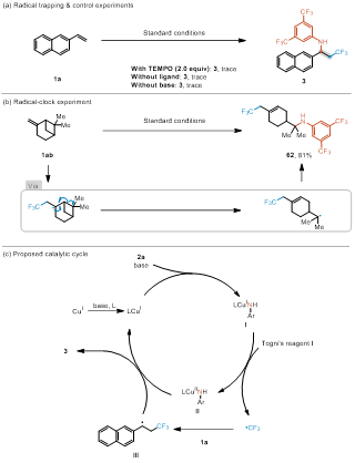 机理研究表明反应经历自由基途径。自由基捕获实验证实TEMPO完全抑制反应进行;自由基钟实验观察到环丁基碳中心自由基的开环产物,为碳中心自由基中间体的存在提供了直接证据。基于实验结果,提出了合理的催化循环:铜(I)催化剂与苯胺形成酰胺铜(I)中间体,通过单电子转移过程活化Togni试剂I生成CF₃自由基和铜(II)物种;CF₃自由基加成到烯烃末端生成苄基自由基中间体;该自由基与铜(II)物种相互作用得到氨三氟甲基化产物,同时再生铜(I)催化剂完成催化循环。