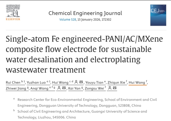 1月,东莞理工学院生态中心研究团队在流动电极电容去离子技术用于水处理方面取得重要突破。该研究设计了一种单原子铁修饰的聚苯胺/活性炭/MXene(FeSA-PAM)复合流动电极,实现了苦咸水脱盐与电镀含铬废水的高效协同处理。成果以Single-atom Fe engineered-PANI/AC/MXene composite flow electrode for sustainable water desalination and electroplating wastewater treatment为题发表于国际期刊Chemical Engineering Journal。该研究由东莞理工学院与德国卡尔斯鲁厄理工学院(KIT)、丹麦奥胡斯大学(Aarhus University)共同合作完成。我校王安祺副研究员为论文共同通讯作者之一。