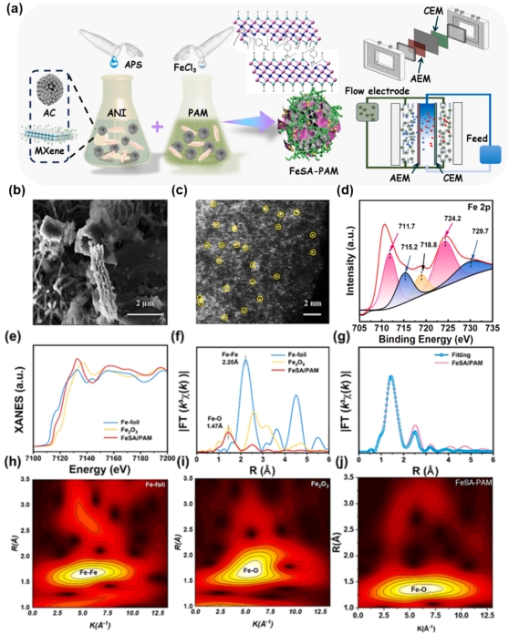 流动电极电容去离子技术是一种新型脱盐技术,通过流动的碳基颗粒电极持续吸附离子,具有可扩展性强、不易污染等优势。然而,传统流动电极存在电荷传输网络不连续、颗粒间电荷转移弱等问题,限制了其性能提升。针对这一难题,研究团队创新性地将单原子工程引入流动电极体系,设计了一种FeSA-PAM三元复合材料:以活性炭为电容骨架,MXene提供高导电层状结构,聚苯胺通过原位聚合构建三维导电网络抑制MXene堆叠,最终在复合物上锚定原子级分散的铁单原子作为高效催化中心。该电极在脱盐方面,盐去除率达125 μg cm⁻² min⁻¹,比传统活性炭电极提升60%;在含铬废水处理方面,对Cr(VI)的去除效率稳定在85-92%,出水铬浓度可达饮用水标准(<0.01 mg/L),且能耗极低(0.006-0.072 kWh m⁻³),电荷效率高达92%。FeSA-PAM的优异性能源于多组分协同,PANI提供吸附官能团,MXene构建导电网络,单原子Fe位点作为催化中心介导Cr(VI)还原为低毒Cr(III)。