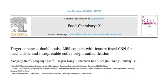 4月 ,我校电信工程与智能化学院何小勇博士在咖啡产地溯源技术领域实现了重大突破,相关研究成果以 “Target-enhanced double-pulse LIBS coupled with feature-fused CNN for mechanistic and interpretable coffee origin authentication” 为题,发表于国际知名食品期刊《Food Chemistry: X》。该论文以东莞理工学院为第一完成单位,南宁师范大学、华南理工大学为合作单位,本校何小勇博士担任通讯作者,团队成员参与了实验设计、数据处理以及模型优化等核心工作。